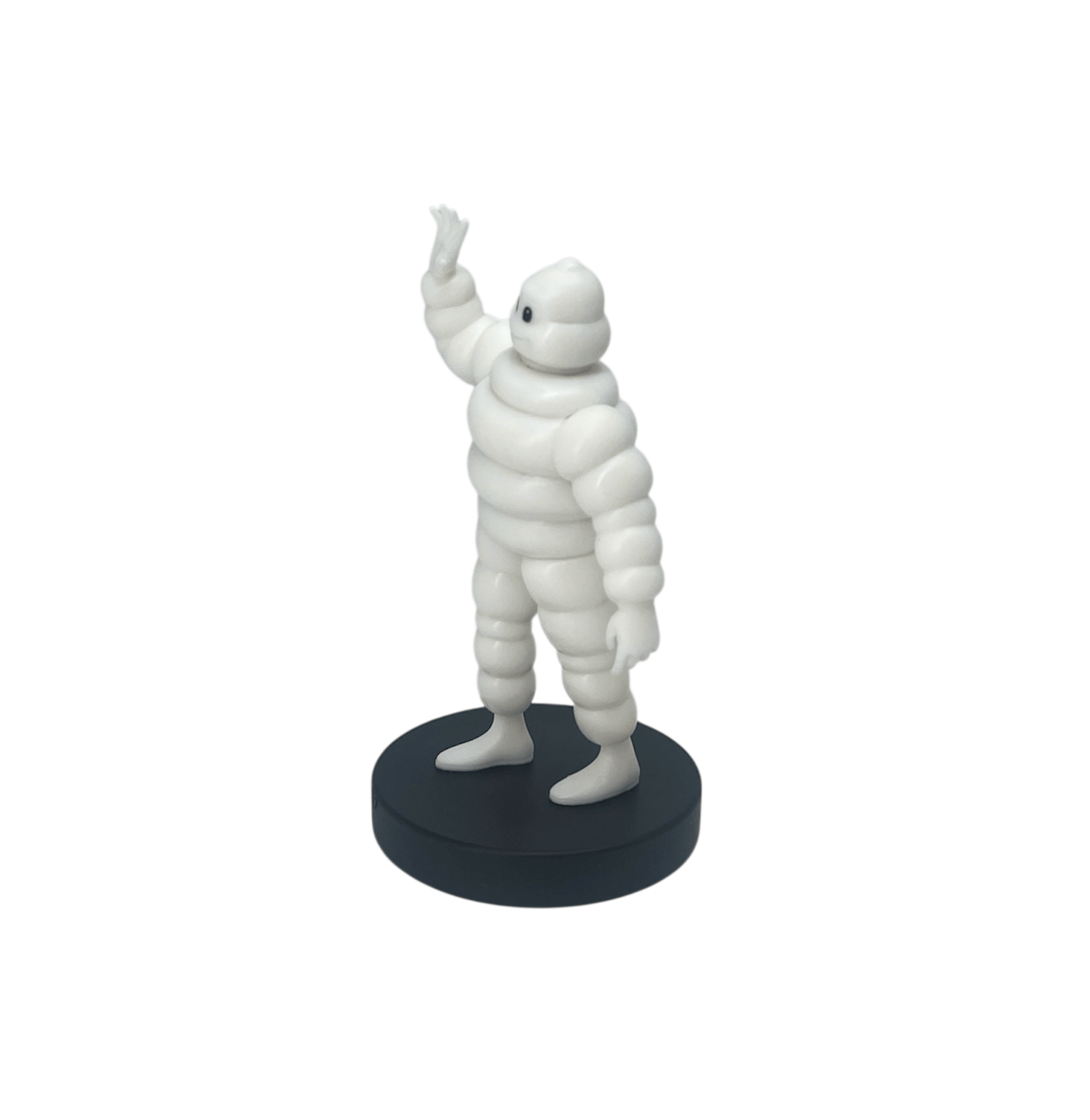 Small white PVC Michelin Man figurine, 10 cm tall. It depicts the famous Michelin character waving his hand.