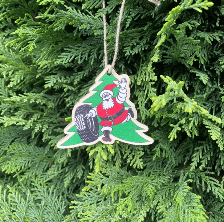 Apportez une touche festive à votre sapin avec cette décoration représentant le célèbre Bibendum en Père Noël, accompagné de son pneu Michelin.